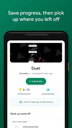 KEY FEATURES • Instant play: There’s no installation needed – look for the "Instant play" button to instantly play full games. • Built-in Google games: Play Solitaire, Minesweeper, Snake, PAC-MAN, Cricket, and Whirlybird – even when you’re offline. • Save your progress: Your progress is automatically saved to the cloud when you see "Progress saved by Play Games." • Gamer profile: Create a custom gamer ID, unlock achievements, earn XP, and level up. • Gameplay recording: Easily record and share your best gameplay moments.