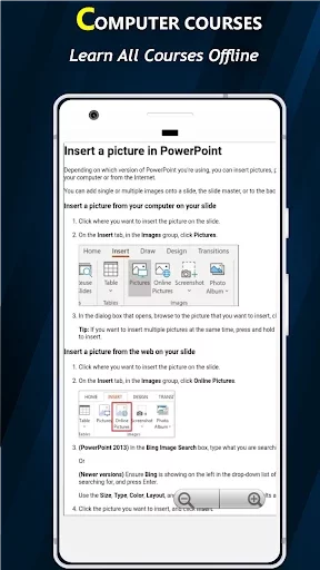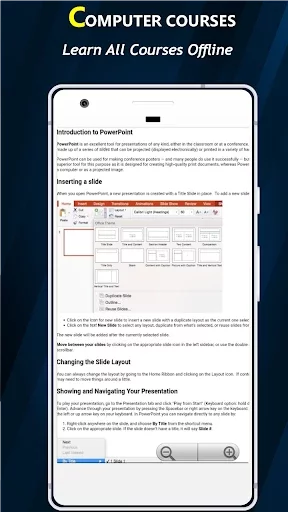 Learn Computer Courses Offline application is easy to use for all types of users where can easily learn their desired course on daily bases.This app is completely offline work and all new comer who are interested to learn basic computer install this app in their own mobile. Through this application learn about the Computer and fundamental basics of computer hardware, software.