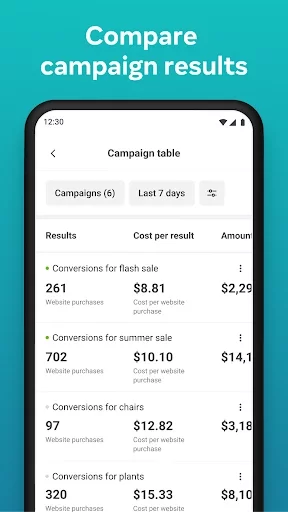 ● View detailed real-time insights from all your campaigns ● Turn campaigns on and off ● Get quick alerts to know what’s happening with all your ads ● Compare campaigns and ad sets using a side-by-side view ● Switch between Pages and ad accounts